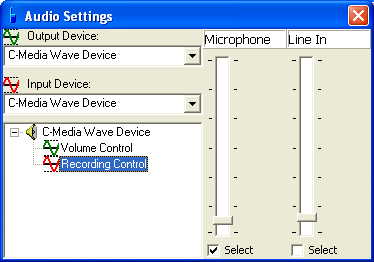 Selecciona el dispositivo de reproducción usado en la vista de árbol. Coloca marcas de verificación de silencio para el micrófono y la entrada de línea. Selecciona el dispositivo de grabación usado en la vista de árbol.